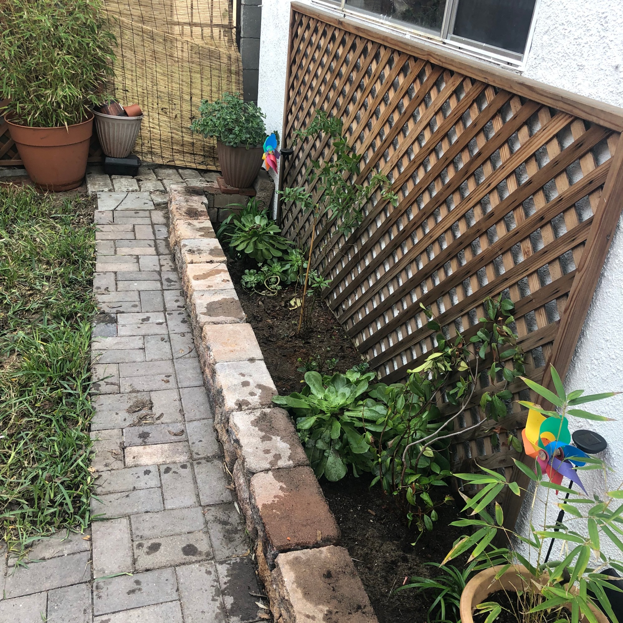 Some plants have grown and others have died. I’m surprised I managed to get some grass growing. I’m hoping a vine plant would flourish, grow, and intertwine on the pergola. I’ve been looking at a table and chair set to put in the center as well. I picture my husband and I having a nice cup of coffee in the morning or wine at night with string lights hanging on top like how you see in the movies =^.^=