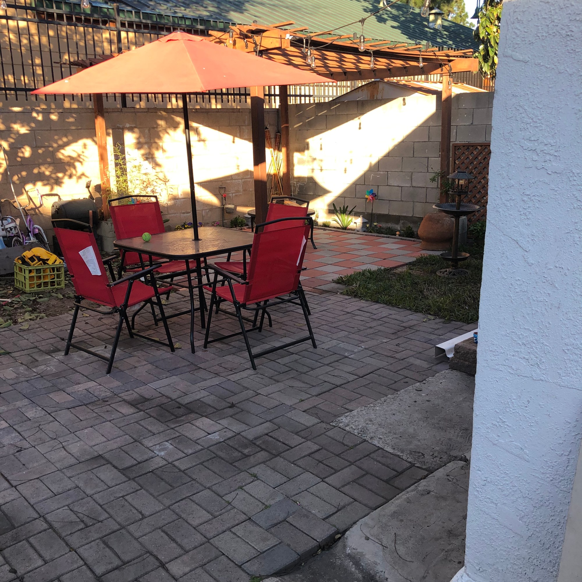 There was so much dirt; we weren’t sure what to do with it. Either get rid of it or cover it with cement, grass, or pavers. We wanted to do this ourselves since we didn’t have the funds to hire a professional and I thought it would be a great learning experience. In the end, we leveled the dirt, covered it with pavers and bought soil to plant a couple of flowers here and there. After a long break, the pergola was build just last year. It shouldn’t have taken four years to clean the backyard but we had other things to fix first, like our house, before we can turn our attention outside.