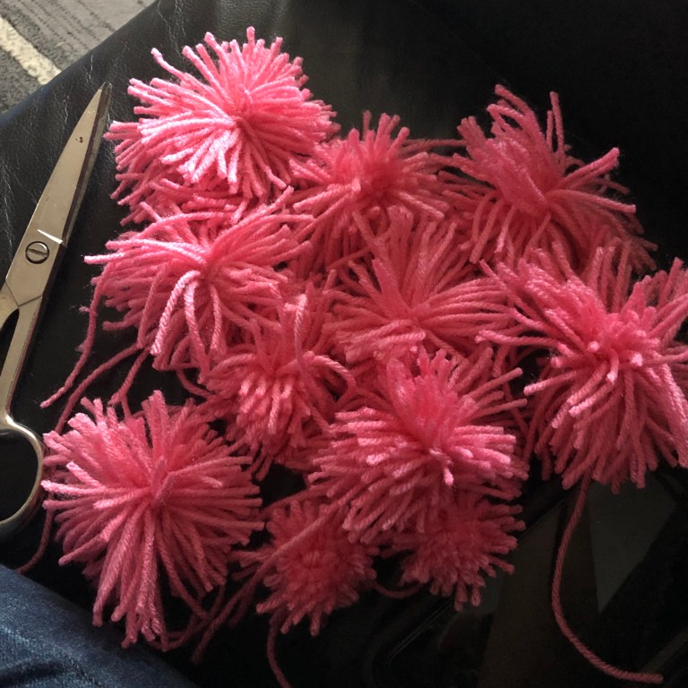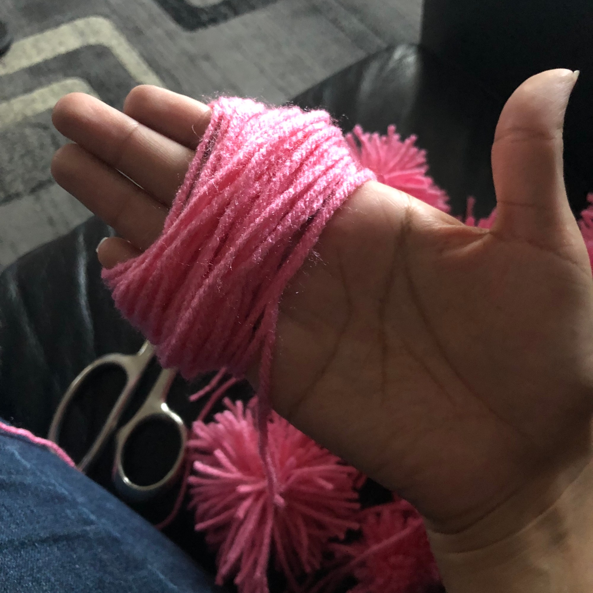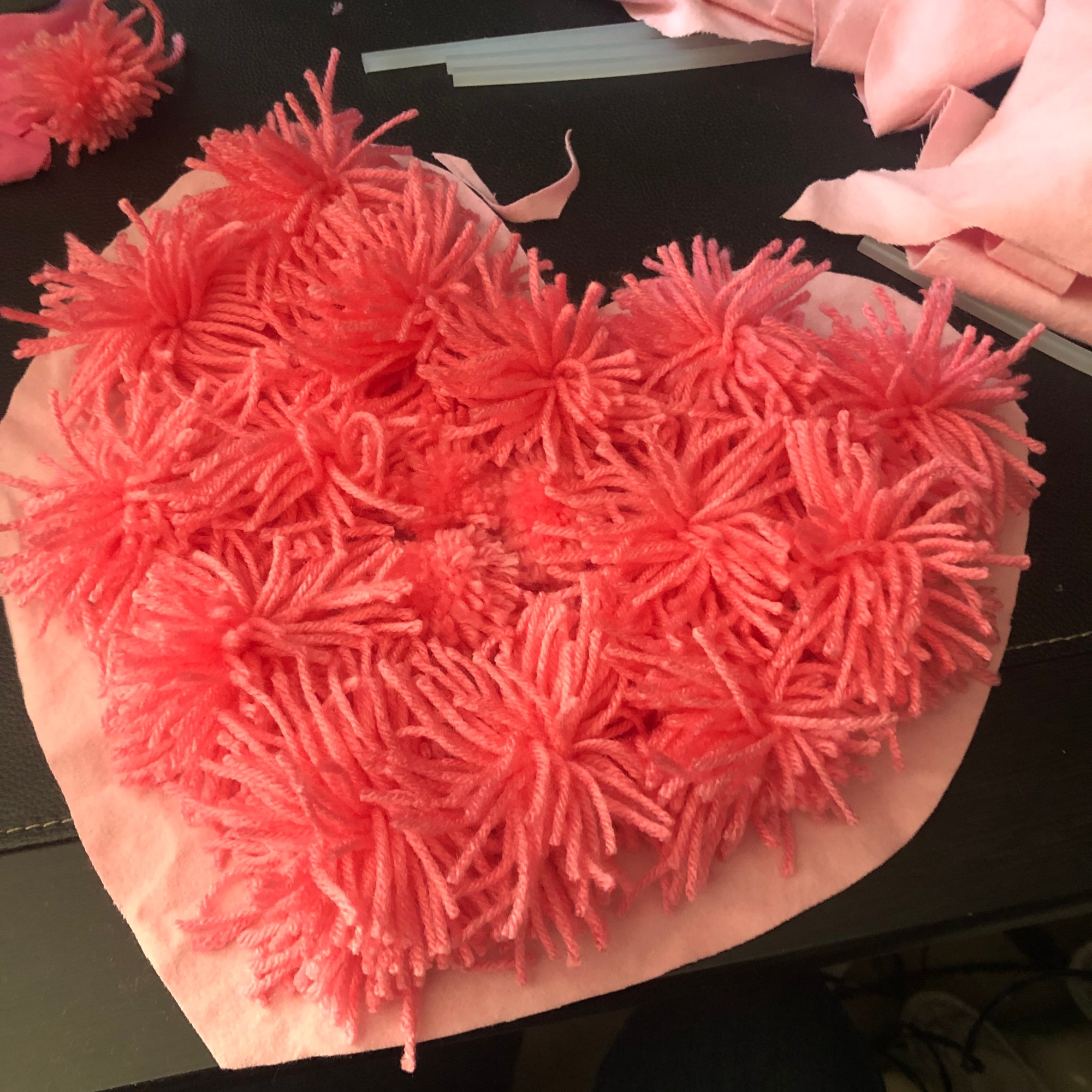 I have a bin full of fabric so I picked a pink fabric from there. I wanted it to be soft but have some sort of texture, so I decided to make messy pom poms from pink yarn and cover one side of the pillow with them. I used hot glue to attach them to the fabric.