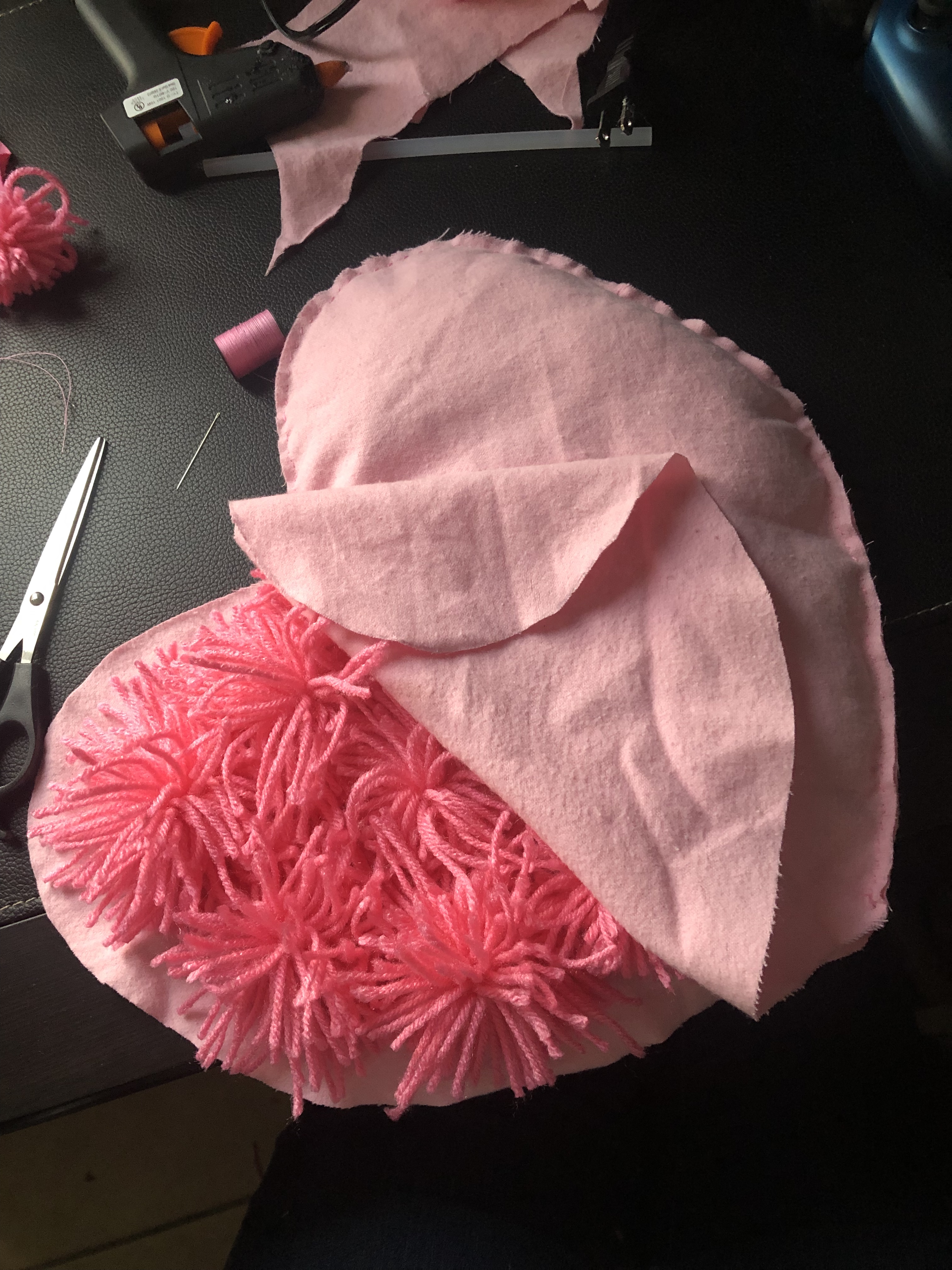 After attaching the pom poms, it was time to sew the 2 heart pieces together.