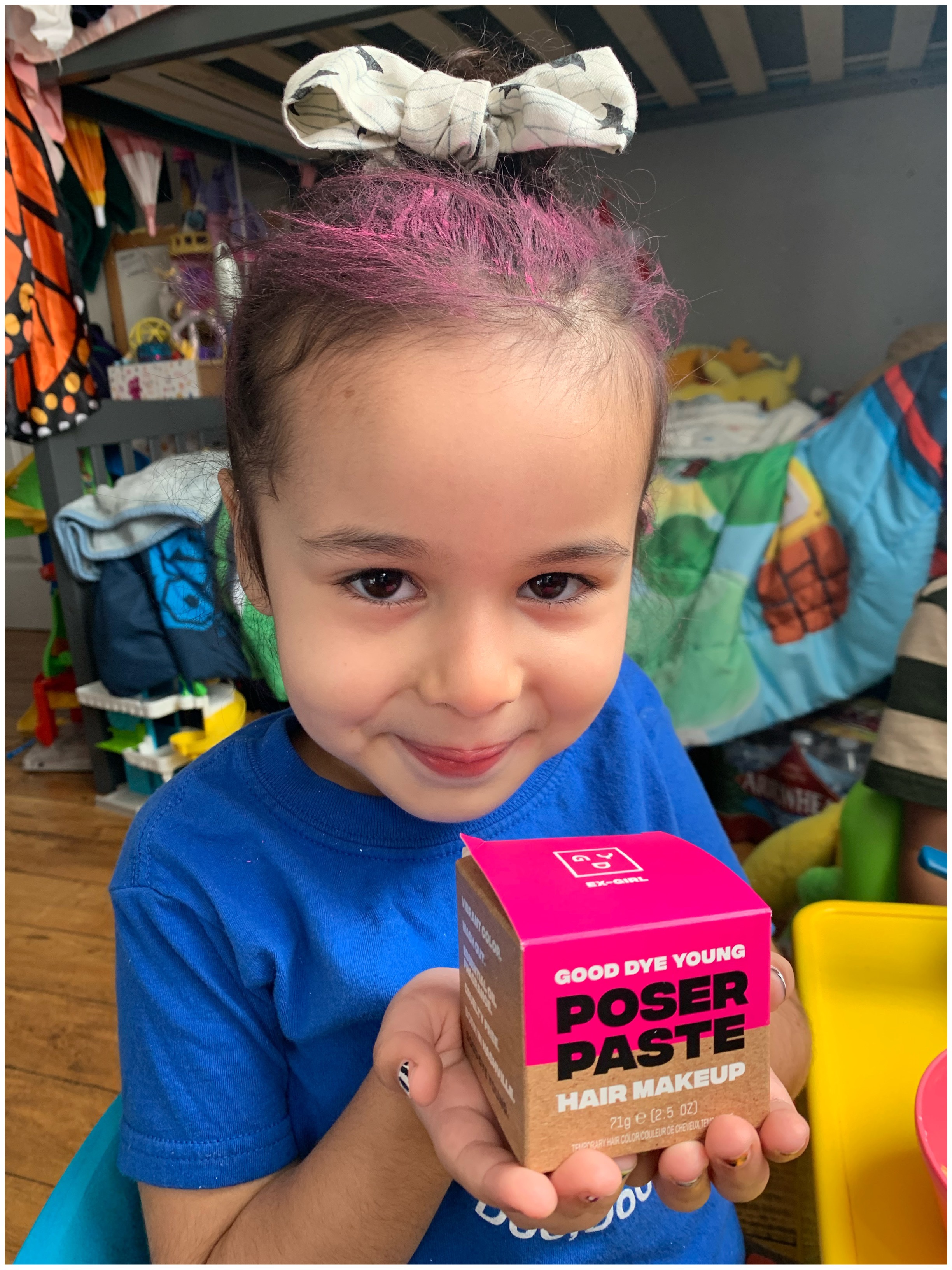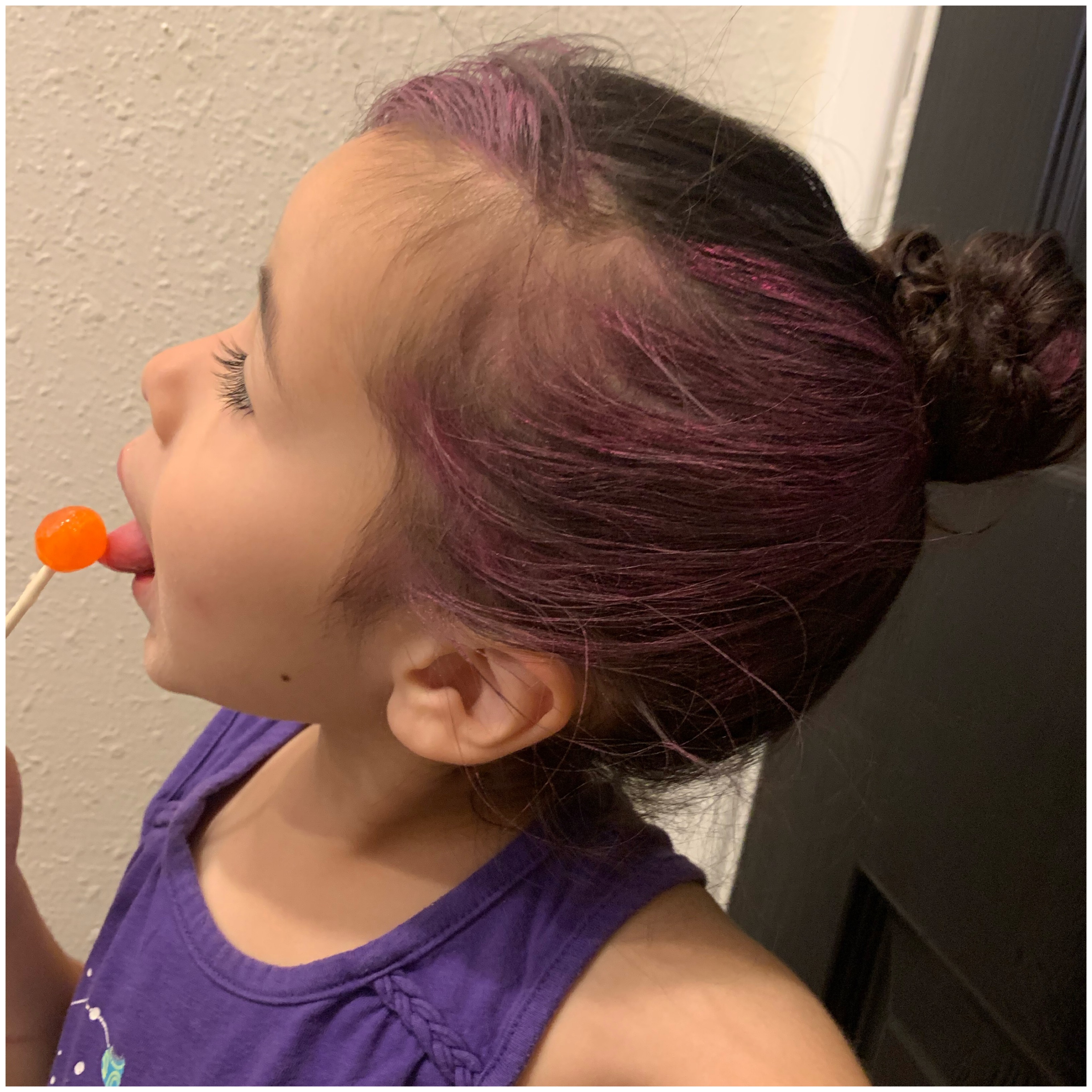 Once I got home, I decided to try it on Zelda’s hair. Like any product I get for hair, I smell it. I honestly wasn’t expecting it to smell citrusy. I personally love the smell. It feels like paste and it’s moist at first but it dries up quick once it’s applied to the hair. I had to work fast and spread it evenly before that happened. Combing the hair after though helped spread the paste so it was okay. Since Zelda’s hair is brown, one application was okay but I wanted the pink to be brighter. I applied a second layer and would comb it through and I repeated one last time. I think overall the pink looks great and it’s noticeable on dark hair.