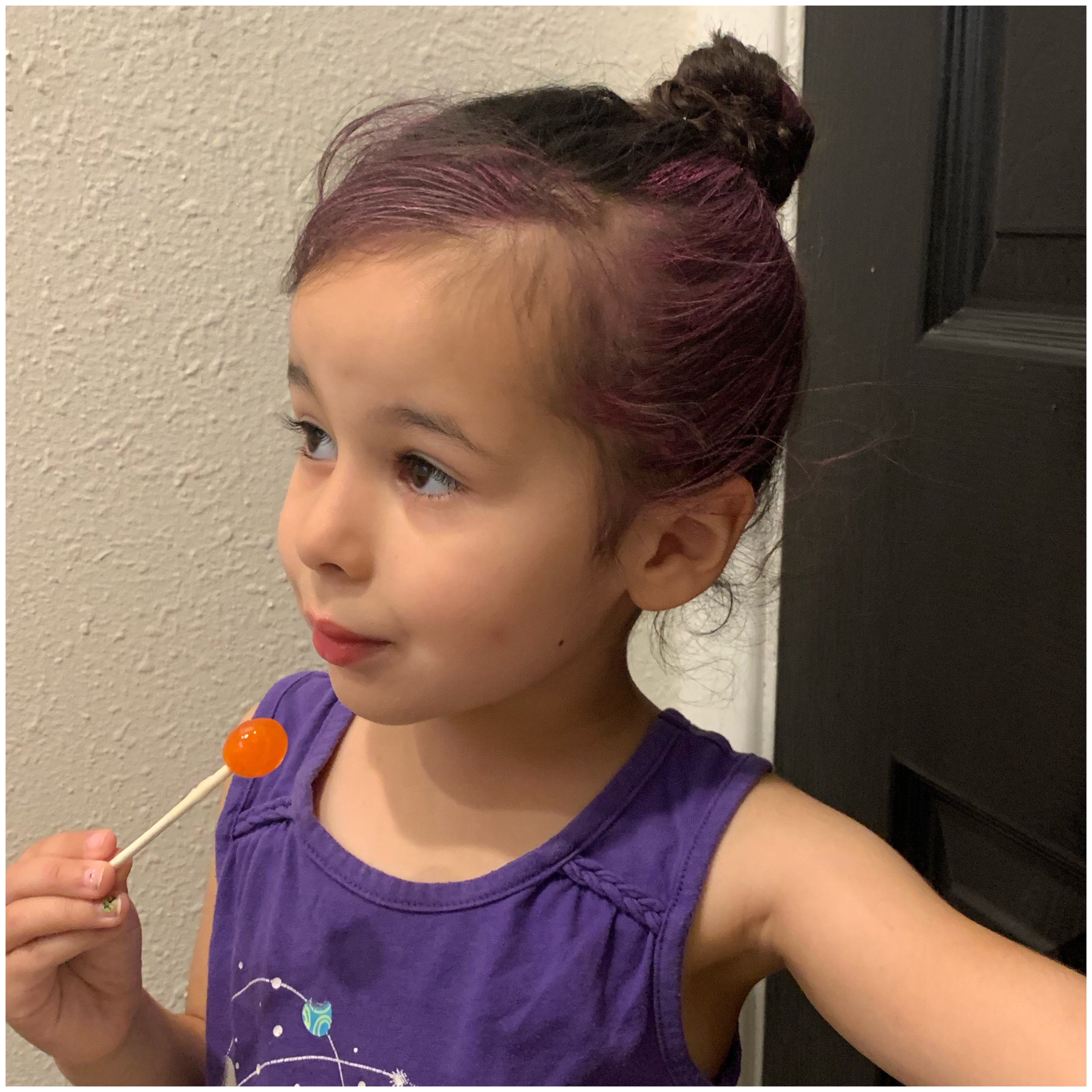 Once I got home, I decided to try it on Zelda’s hair. Like any product I get for hair, I smell it. I honestly wasn’t expecting it to smell citrusy. I personally love the smell. It feels like paste and it’s moist at first but it dries up quick once it’s applied to the hair. I had to work fast and spread it evenly before that happened. Combing the hair after though helped spread the paste so it was okay. Since Zelda’s hair is brown, one application was okay but I wanted the pink to be brighter. I applied a second layer and would comb it through and I repeated one last time. I think overall the pink looks great and it’s noticeable on dark hair.