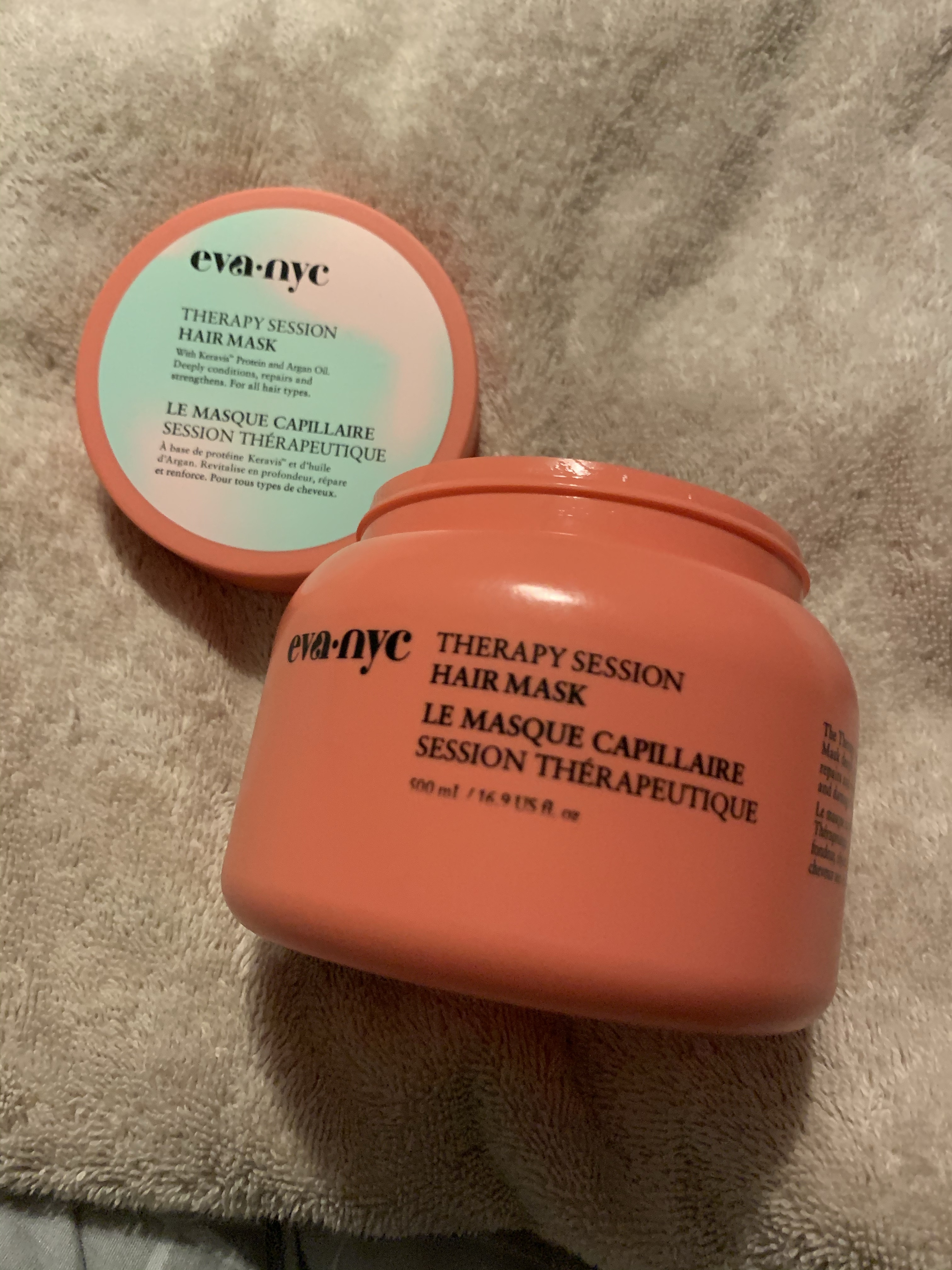 Straight from the Ulta website: “Eva NYC’s Therapy Session Hair Mask is a deep conditioning treatment that repairs and strengthens dry and damaged hair. Argan oil feeds hair with vitamins and nutrients, while Keravis delivers optimal anti-breakage benefits and is scientifically proven to dramatically increase strength and flexibility.“