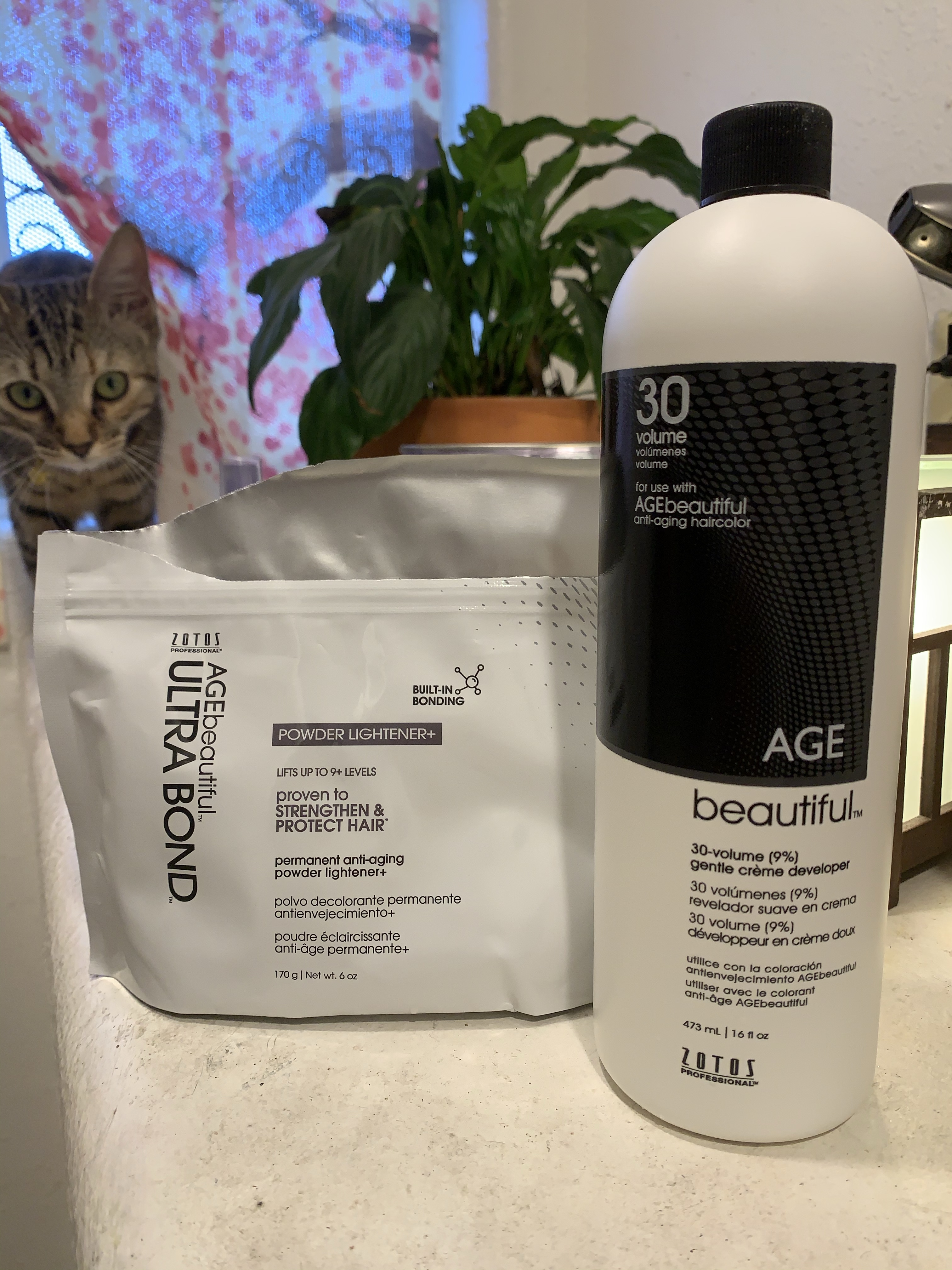 For bleach, I’m using Zotos Professional Ultra Bond power lightener with 30 developer. The instructions says 1 scoop of power bleach and 2 oz of developer. I followed the directions but it came out too thick so I added half an ounce more of developer so the bleach is easier to spread.