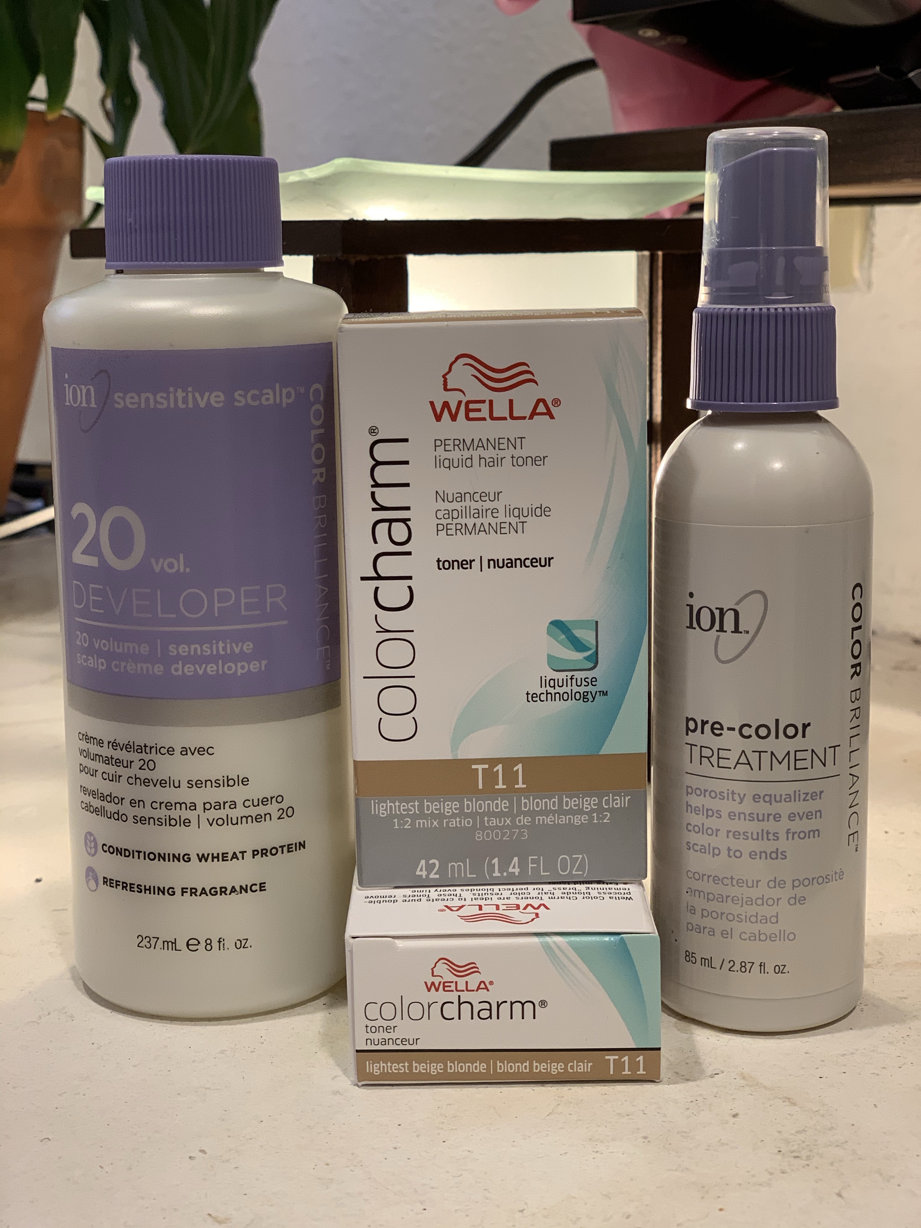 I hopped in the shower to wash off the hair treatments and now it’s time to tone….finally! First time trying Wella T11 toner by itself so I was very much excited. Another first is the Ion pre-color treatment. Supposedly it helps even out the porosity level of the hair so when the hair is colored/toned, it comes out even. So I sprayed this all over my hair first before toning and hopefully it works.