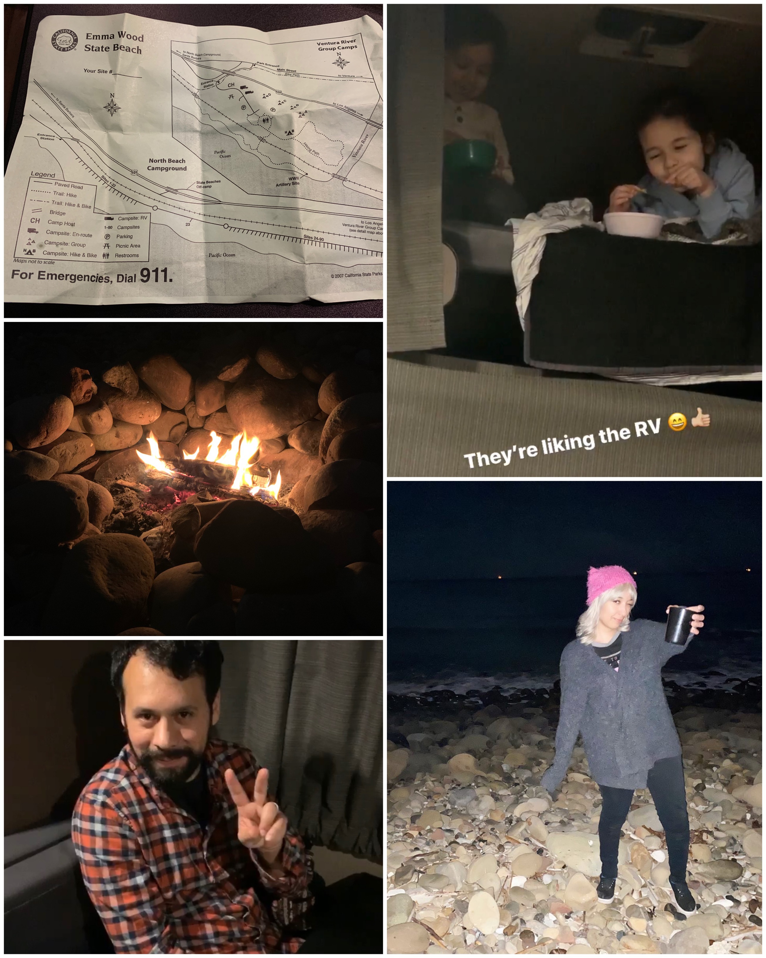 Once we reached Oxnard, we wanted to stop by Walmart to pick up some stuff I forgot to grab on Thursday (we always forget something). I read that most Walmarts allow overnight parking but it’s best to ask the manager on duty if it’s okay. We were thinking about it since it was dark already but in the end we continued to drive north. It was my turn to drive and I was a little nervous because I have never driven anything that big ever. It was dark so there wasn’t much traffic and I took my time. The first campsite we arrived was closed. We drove to the second campsite and it was closed as well. So after about 2 hours of driving, I was getting frustrated and was regretting leaving the Walmart parking lot. We’re back in PCH and I noticed to my left Emma Wood State Beach. I can see parked RVs and some empty spots. I remember this was one of the campgrounds I wanted to reserve but it was too late. We decided to check it out. I pulled up to the pay booth which was empty, it was already 8:30pm. We saw a list of numbered campgrounds with X marked on some numbers (we assume spots that were already taken) outside the pay booth and a set of instructions and a box outside. In order to stay for the night, we grabbed an envelope, write the type of RV, how many nights staying, the number of the spot we are occupying and put $40 (which is the fee for 1 night) inside the envelope. We dropped the envelope in the box and we drove to the spot. I parked the RV and I was relieved and calm that we made it safe. We lit up a bonfire and we made s’mores and enjoyed the sound of the ocean. I was so frustrated driving around but it was so worth it because I ended up loving this place. After 2 drinks, hot dogs, and snacks, we called it a night. The kids slept on the top bed and us adults in the actual bed. I wanted the kids in the bed but they loved the top bed. I was just worried they’ll fall. Triforce got comfy with the kids. That was the end of night one.