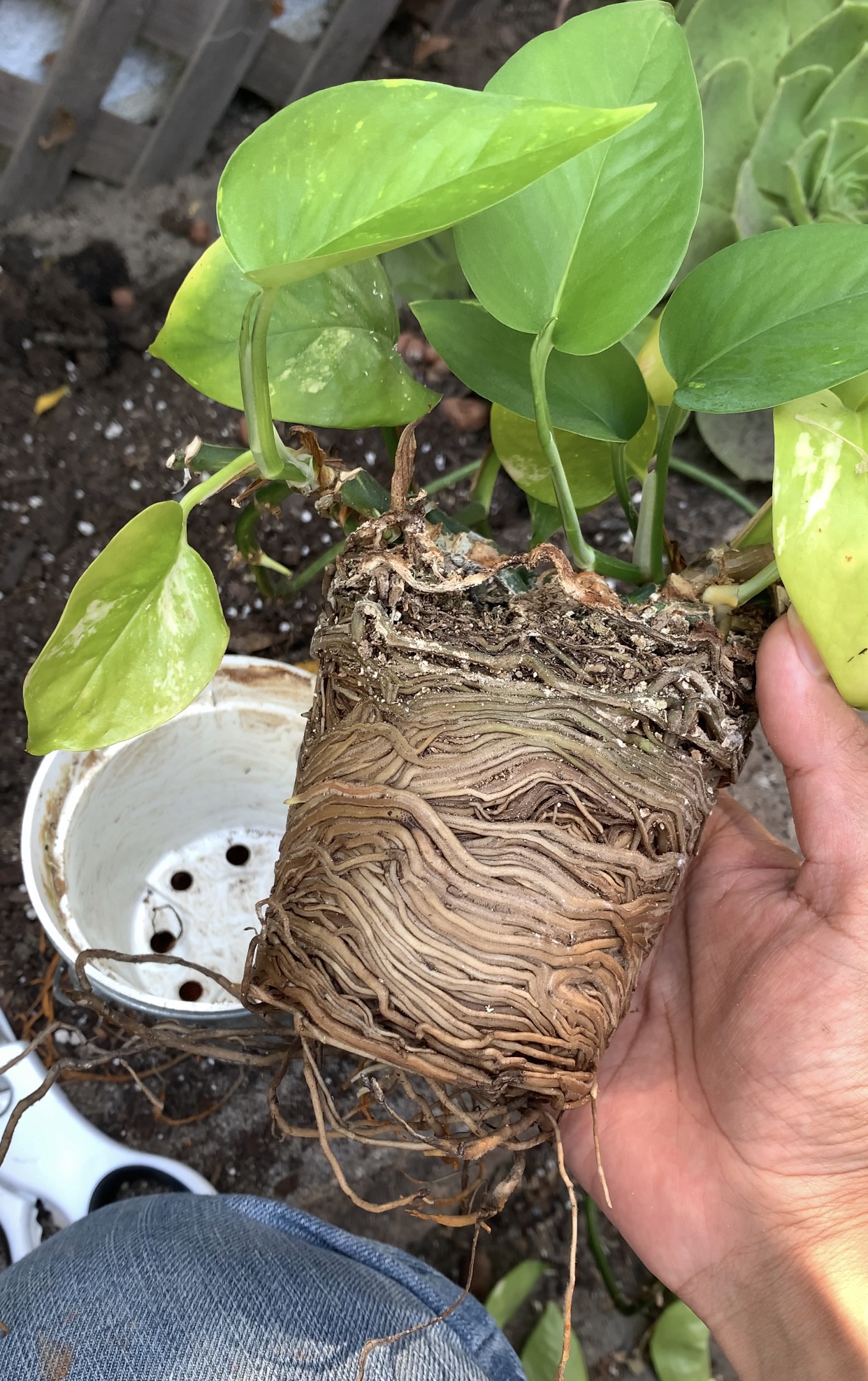 I took the pothos outside to inspect the inside of the pot and to my utter surprise and shock, the inside was all roots! Literally all roots and no dirt.