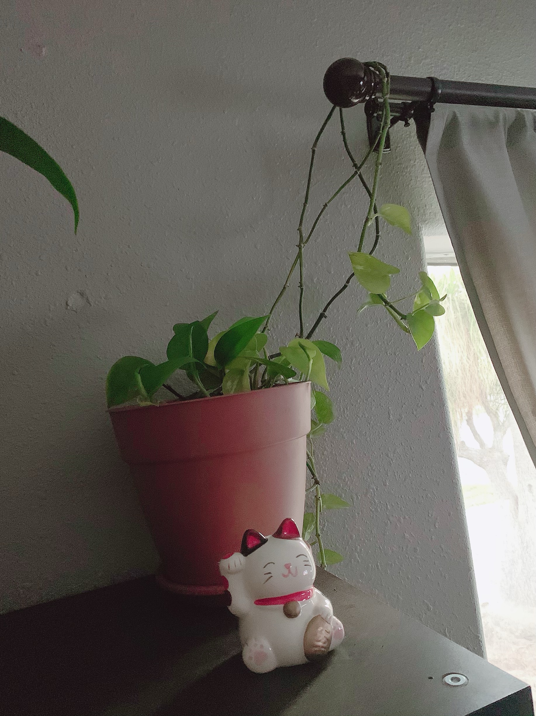 After trimming it, I put it in a bigger pot. I’m hoping it doesn’t die on me now that it has space to grow even bigger. The leaves did feel rubbery at first but now they feel smooth. The change was a shock but I’m glad the pothos is doing better.