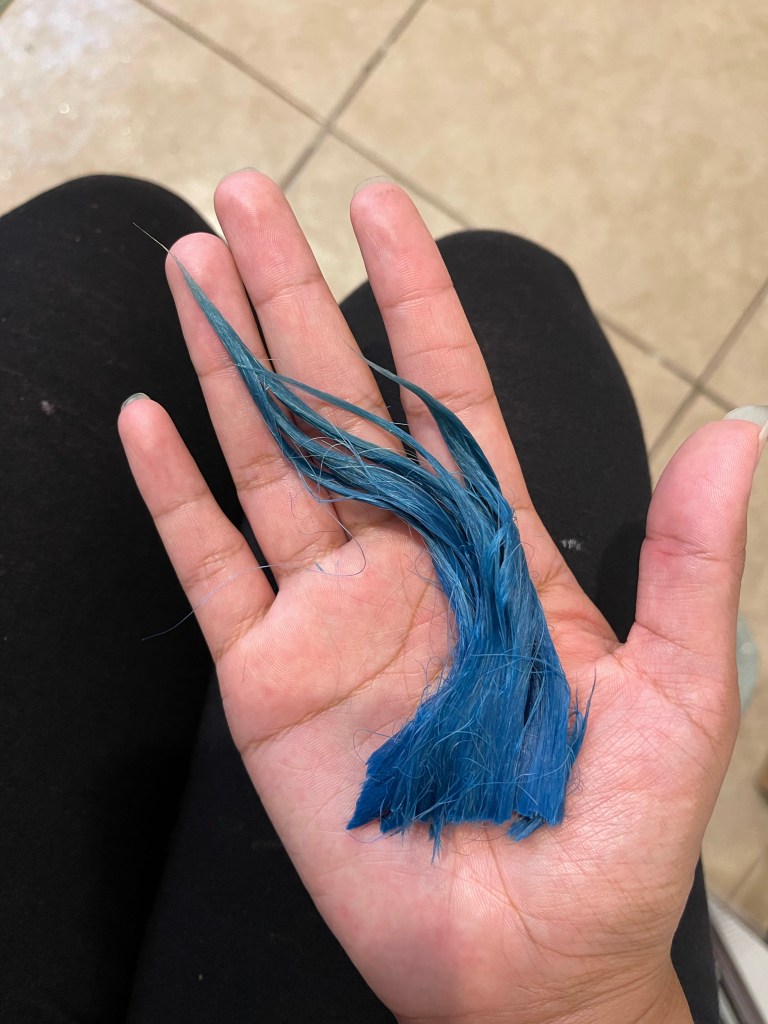I know I said I wasn’t going to use bleach again but I had to this time around to get rid of the blue. My original plan was to let the blue fade out so I can apply yellow hair dye but it was taking forever and I was done with blue. I was thinking of buying a color remover but those smell so bad in my opinion. I was also thinking about the vitamin C method and the dish soap with baking soda but those dry up my hair super bad. In the end I did a bleach wash which is bleach, 20 volume developer, and shampoo mixed together. I was very careful not to apply this mixture on my roots because it will bleach them. The process was so slow but after much patience and caution, I think I did a good job on getting the blue out. I did notice 3 spots that have a light tint of blue but I didn’t think it would be so noticeable after drying my hair so I let it be.