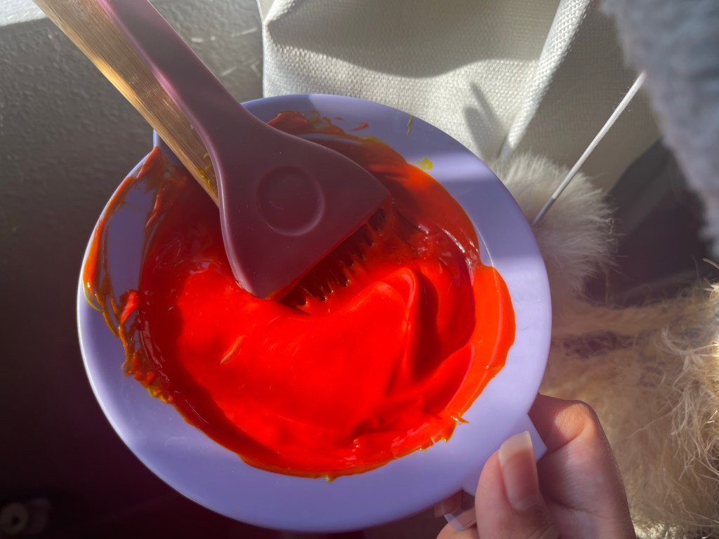 Since orange is darker than yellow, it wasn’t necessary to remove the color from my hair. I simply applied the orange on top of the yellow. I did have a little bit of Cosmic Sunshine left, so I used it all up by mixing it with Sunset Orange. I don’t think it changed the color much. The mix still very much looked bright orange.
