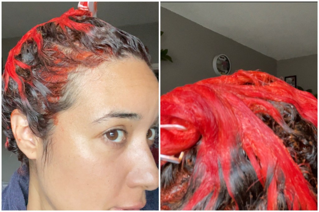 After letting my hair air dry and styling it, the overall color, to me, was an orange red. It reminded me of a sunset. Depending on the lighting, it looks red or orange or a combination of both. Either way, I’m happy with it.
