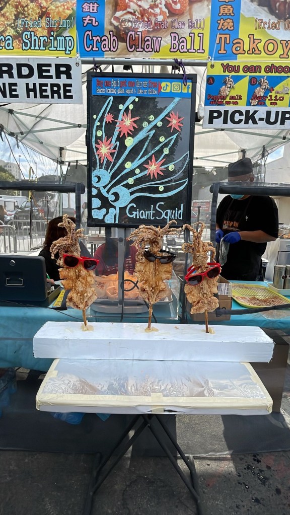 I always wanted to go to the 626 Night Market. I would hear good things but also bad. The good being the delicious food. The bad stuff is the long lines and how crowded it gets. When my friend told me of a ‘mini’ 626 Market, and it’s free, we were excited to go check it out. This one took place in Santa Monica close to 3rd street promenade.