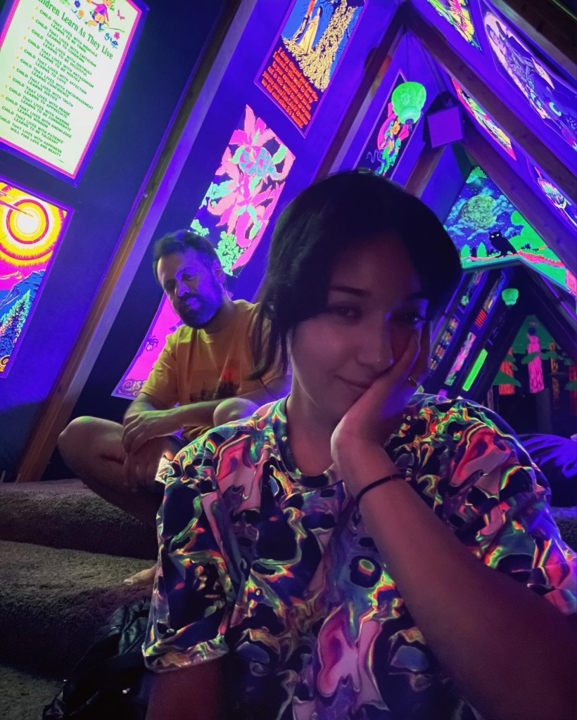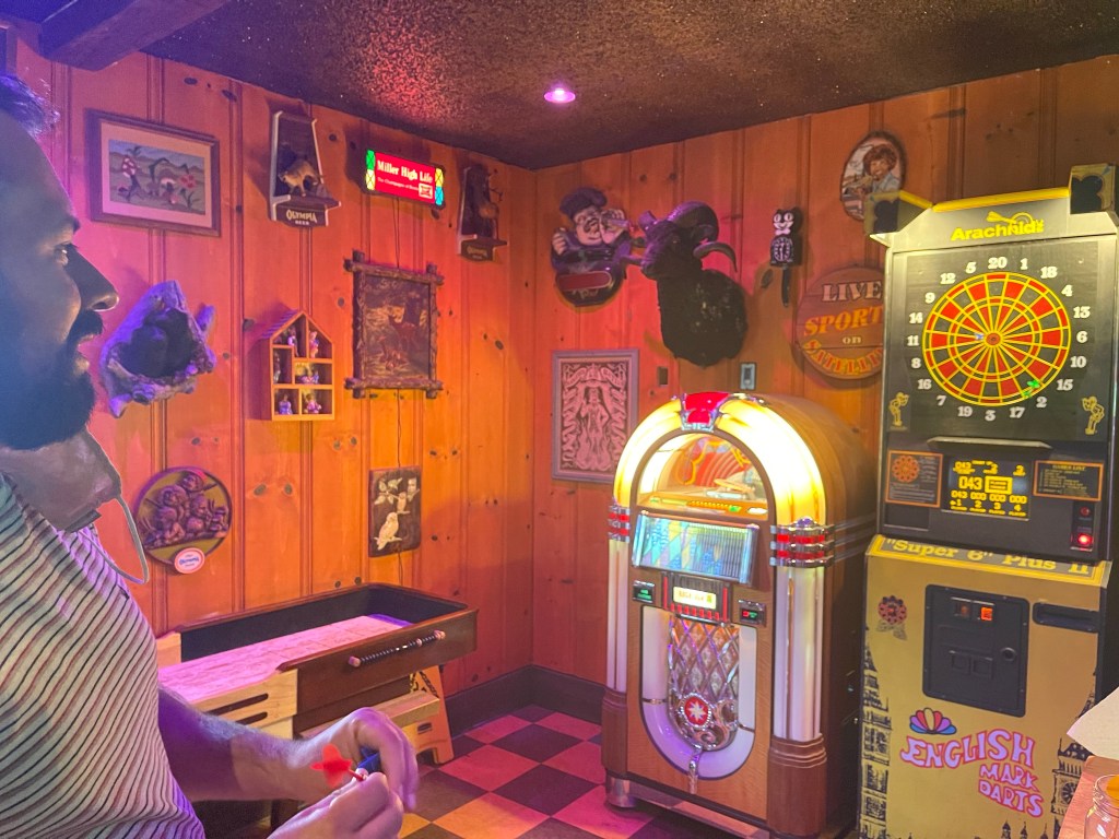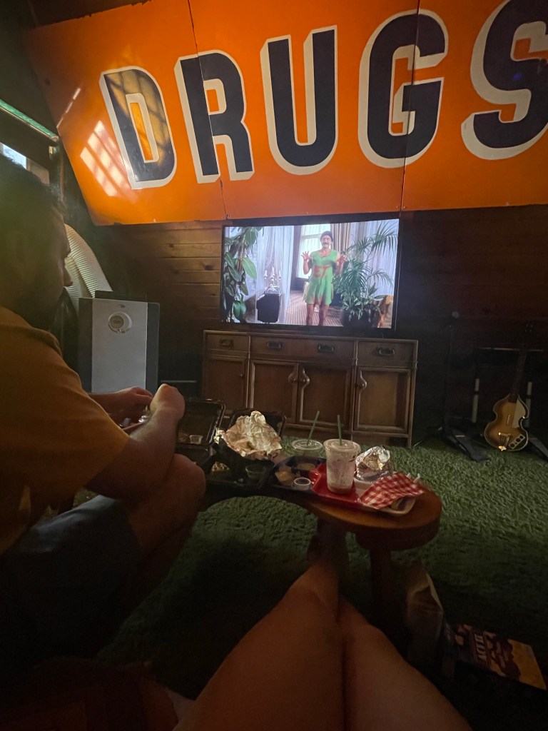 We ventured out for a bit to explore the area. There is a cute restaurant to dine in and a game room with a bar. I got spooked because the moment we stepped foot inside, everything turned on. Everything is motion sensor so pretty cool. I thought we had to pay for the games but it turns out, they are all free. We had a great time playing the arcade machines while the jukebox played music. We were the only ones there which felt kinda eerie. Very ‘Cabin in the Woods’ vibe. After being there for a bit, we went back to the room to continue smoking. We sat in the living room and started watching a Cheech and Chong movie.