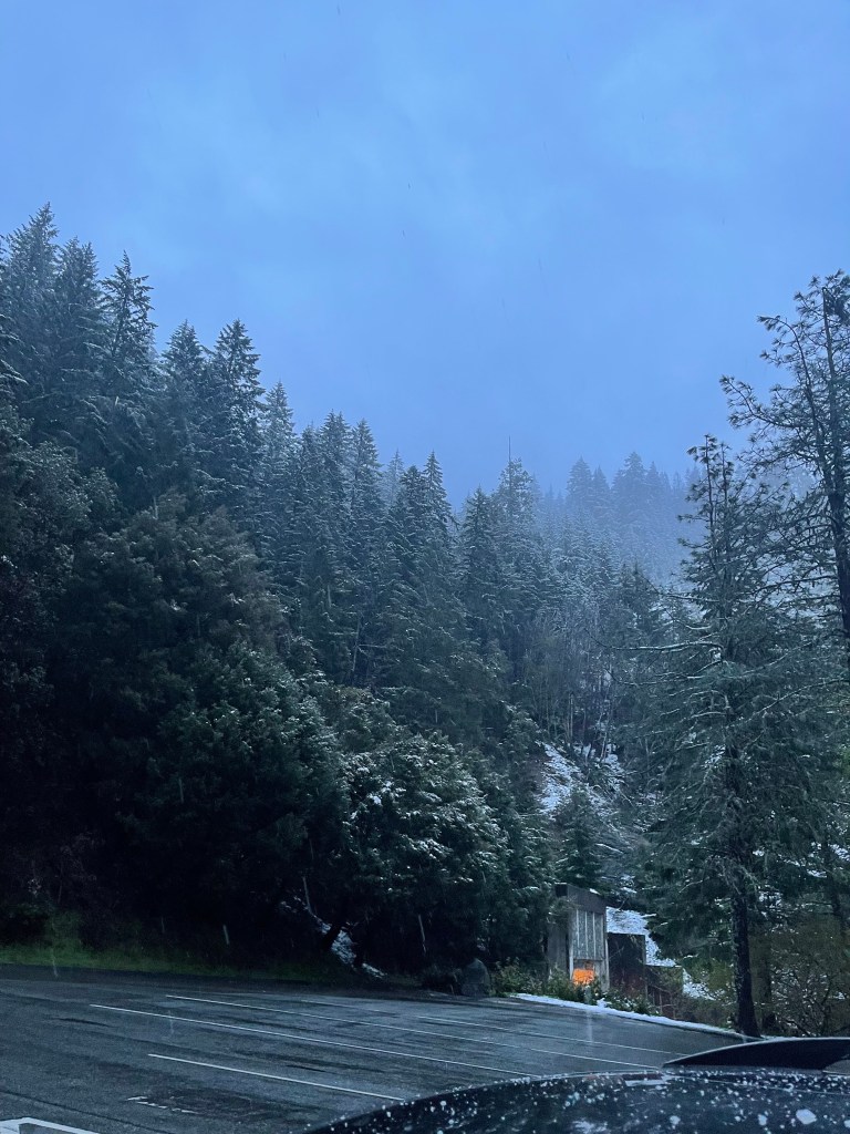 As we leave the woods, we’re approaching the Oregon state line. Our plan originally was to stay on the 101, pass the state line, and spend the night at Gold Beach. We changed our minds because of the snowstorm advisory warning. We still had about 3 days before we turn back and drive home but we have never been caught in a snowstorm. I haven’t even driven in snow before so I was getting worried. From the 101 freeway we changed direction and drove to the 199 freeway. We made a pit stop right before we reached the state line and as I slowed down the car, I realized it was snowing. A sense of fear and wonder held me for a bit. As my husband ran to the bathroom, I stepped outside and admired the view of snow covered pine trees around me. I felt I was on a level of Donkey Kong country.