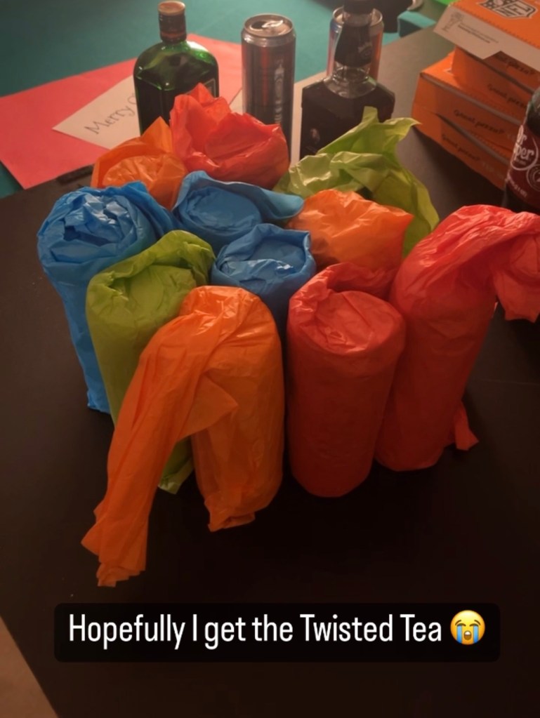 My friend bought 11 tall cans of various alcoholic drinks and we wrapped them up and mixed them around. We all picked one randomly and had to finish it before we started our White Elephant and Secret Santa. Nobody got what they wanted.
