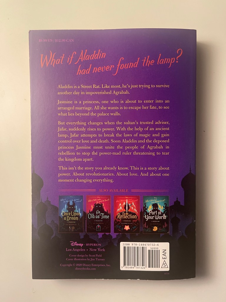 I enjoyed the story. I did struggle the first few pages but I kept reading and it did get interesting. Instead of Aladdin being the main character, it’s Jasmine. She develops a friendship with Genie when they realize that their situation is similar; they’re both trapped. The first time Jasmine escaped the palace, she sees life outside her prison isn’t that great. While her dad, the Sultan plays with his toys and kites, the poor people of Agrabah struggle everyday for basic necessaries such as food. She promises to be better and help her people once she becomes Sultana. I like that Jasmine took charge and Aladdin was there as support. I never saw Jasmine and a weak princess. She’s pretty badass even in the movie but I enjoyed that they added more of that in the book. She’s not afraid to put herself at risk for a greater cause.