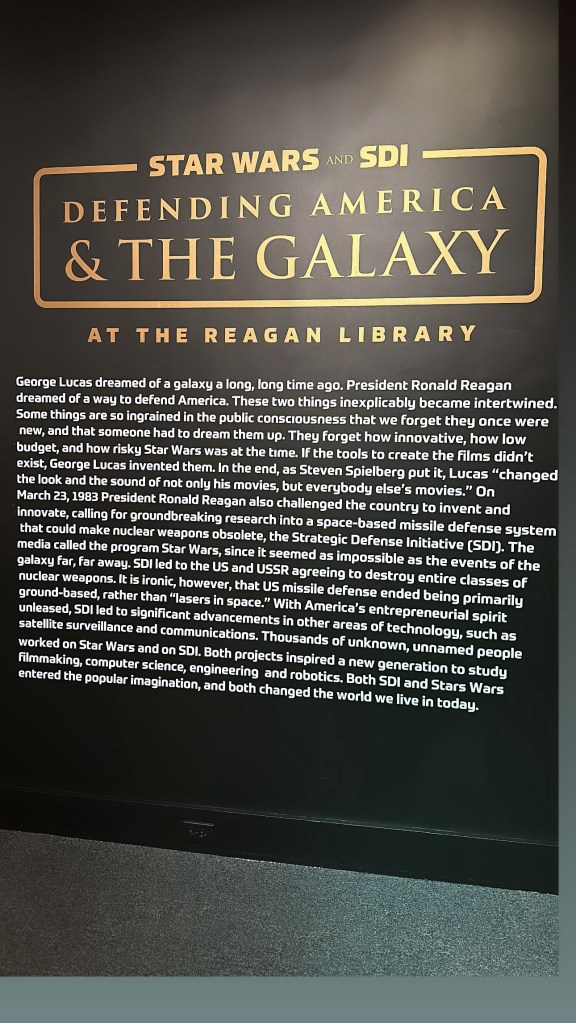 The Star Wars exhibit isn’t until the very end of the tour. The connection between Star Wars and Ronald Reagan was at the time, Reagan created SDI, Strategic Defensive Initiative. The plan was to create a space based missile system, create lasers in a way, to eliminate the use of nuclear missiles. The media thought it was far-fetched or silly and started addressing Reagan’s project as Star Wars.